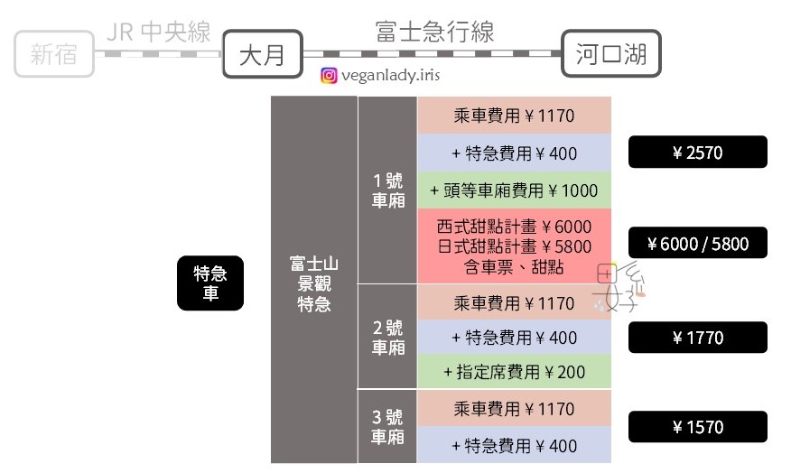 這裡有一點蠻重要的,JR 東京廣域周遊券不能 cover 富士急行線的指定席位費,所以如果你搭「富士山特快 1、2 車廂」或「富士山景觀特急 1、2 車廂」,都要自己再付指定席位費 (當然甜點計畫也不行 cover,沒有在補差價的喔)