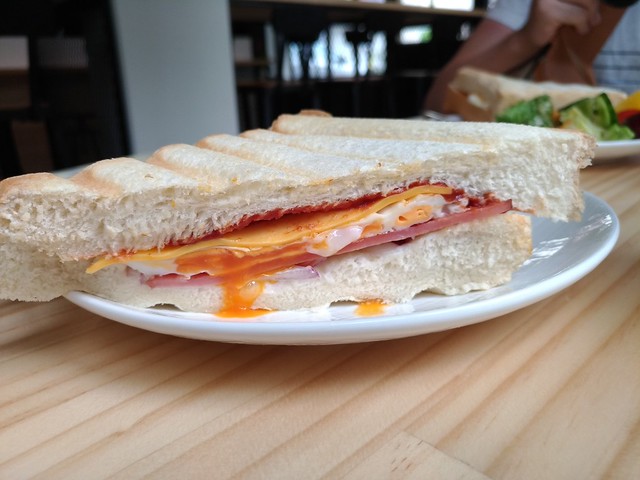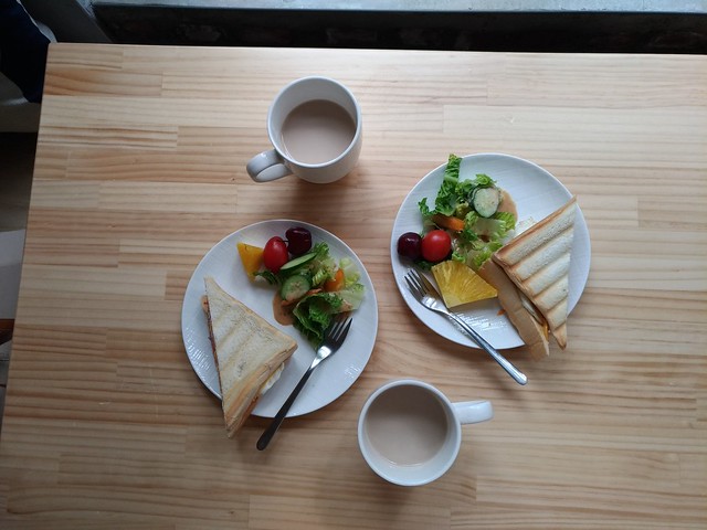 火腿起司蛋熱壓吐司、沙拉和鮮奶茶
