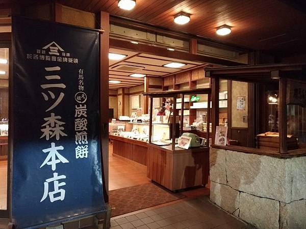 泡完金湯出來天就黑了,晚上的有馬溫泉超冷清,6點店家就都關了,只剩這間三ツ森本舖,是有名的碳酸煎餅老店,有馬溫泉這一帶到處都可以一直看到他們的分店