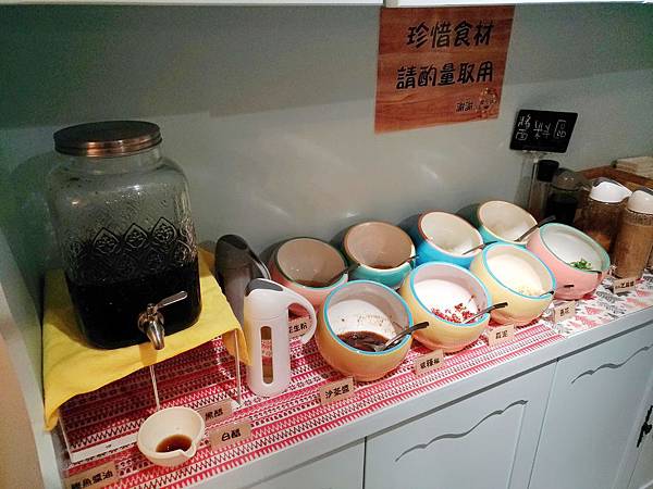 醬料台很齊全,你想得到常用的應該都有,用馬卡龍色撞色的深盆盛裝,活潑輕鬆的感覺