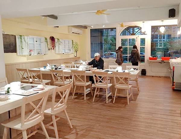 店內留走道的空間十分寬敞,整體用木地板、淺白色木紋的桌椅、假草營造出有點鄉村風的感覺