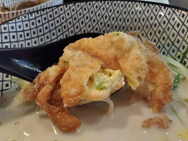 金黃色的炸蛋是荷包蛋,炸過酥酥脆脆的蛋皮泡軟吸附湯底,一咬就會爆出濃醇的豆漿