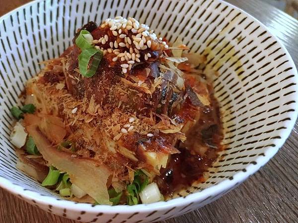 整碗裡有大片柴魚也有磨碎的柴魚粉,加上為數不少的白芝麻,很有和風的感覺;醬汁則是像XO醬,甜甜辣辣,有蝦米的香氣