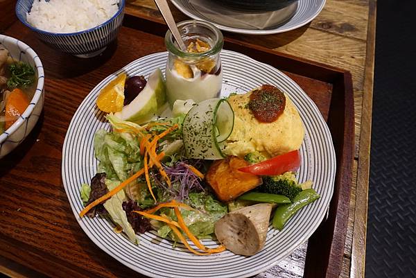用的是有些復古的幾何圖形陶瓷器皿,好像精緻的定食,附上沙拉、炒蛋、莓果優格,又有點日式洋食的味道