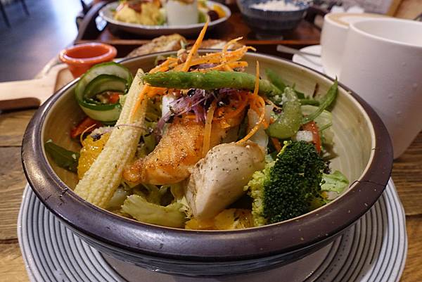 可別小看這一大盤蔬菜,除了基本的葉菜類,還有蘆筍、碗豆、小黃瓜、紅蘿蔔、紫花苜蓿、彩椒、花椰、玉米筍、香橙、堅果等多樣化食材