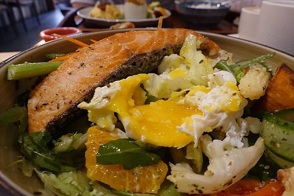 附上的生菜沙拉和烤食蔬也補充了一餐所需的纖維,一顆圓圓厚厚的炒蛋更是口感和味道兼具