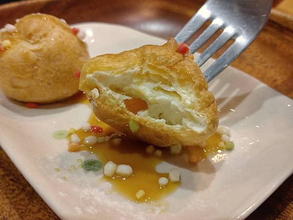 炸泡芙的長相和口感都很像大家熟悉的義美小泡芙,只不過它是放大版,外皮是軟的,有層層堆疊的感覺