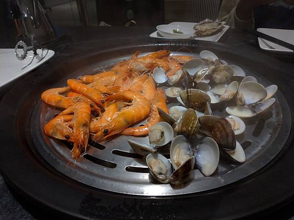 可以透過透明的蓋子稍微看到蝦子漸漸由灰轉紅,蛤蠣也一顆一顆打開