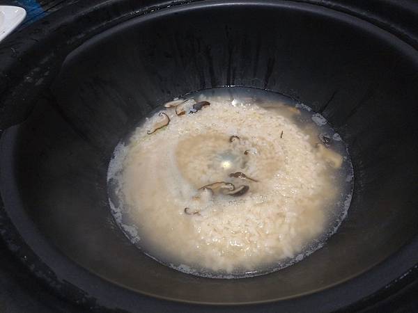 蒸完上面這些,服務人員幫我們把蒸架拿起來稍微翻攪一下底下的粥,可以看到米已經有點膨脹了