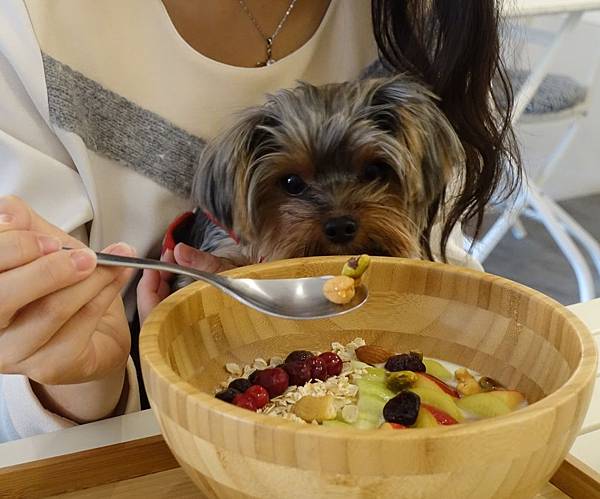 大木碗裝的優格碗看起來就很澎湃,裡面有蘋果、奇異果、芭樂,還有燕麥、堅果、紅莓和藍莓,配料豐富,賣相很美