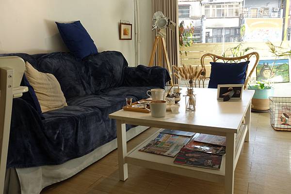 沙發鋪上湛藍色柔軟大毛毯,超級放鬆~~洋哥一躺下去就不想起來,連豆豆也淪陷😙