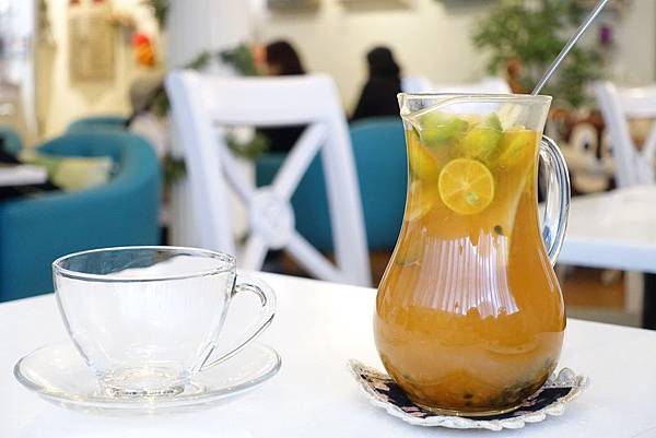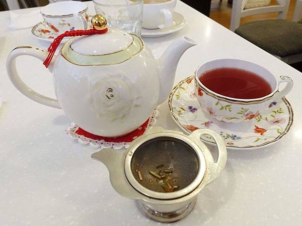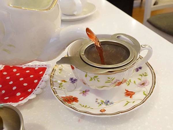 點餐的時候老闆也有提醒我這個口味會有花草梗在裡面,上桌時會附上濾網(茶壺造型的濾網也超Q),但可能還是會有一些細碎的茶渣跑到茶裡,問我能不能接受