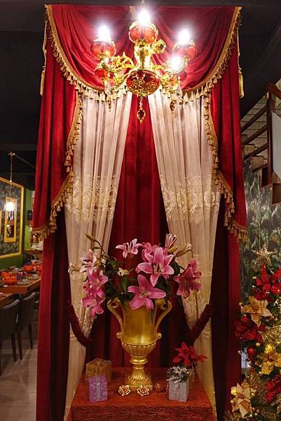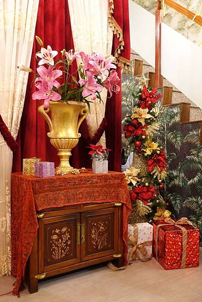 一進門是暗紅色長布幔隔成的玄關空間,古典花瓶插上新鮮香水百合