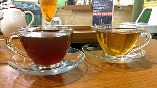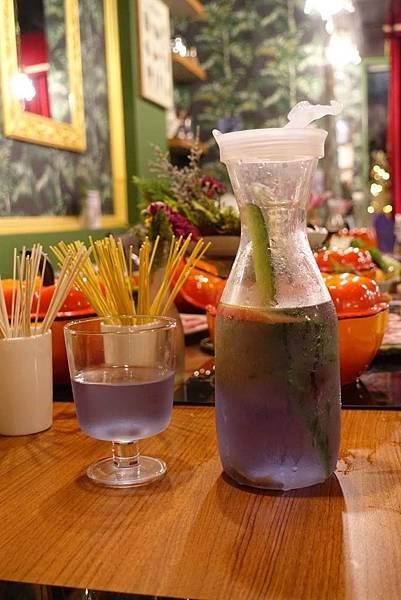 附上的開水是有機花果水,也是喜園的特色之一,裡面有芳香萬壽菊、紫蘇葉、小黃瓜、薑黃葉、檸檬片,夢幻的藍色來自近幾年很夯的蝶豆花(孕婦不能喝哦)