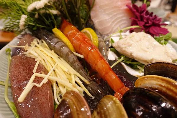 內容有小卷、蛤蠣、手工花枝漿、魚片、天使紅蝦和汶萊有機藍蝦