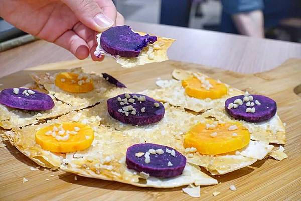 甜而不膩的糖汁稍微黏住撒在上面的杏仁碎,加上黃色和紫色雙色地瓜片,有澱粉淡淡的甜味又很有飽足感