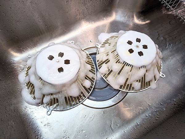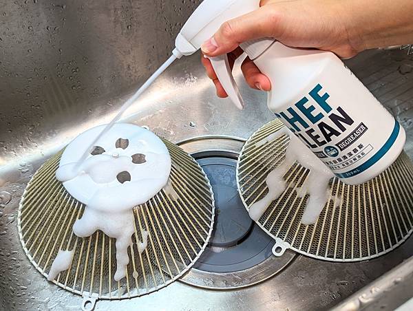 現在有了去油汙廚房清潔慕斯,就可以把油網洗乾淨重複使用了!耶~~