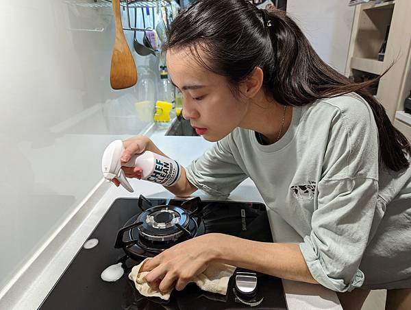 現在我如果有煎東西,油噴得到處都是,煎完就會趕快噴去油汙廚房清潔慕斯