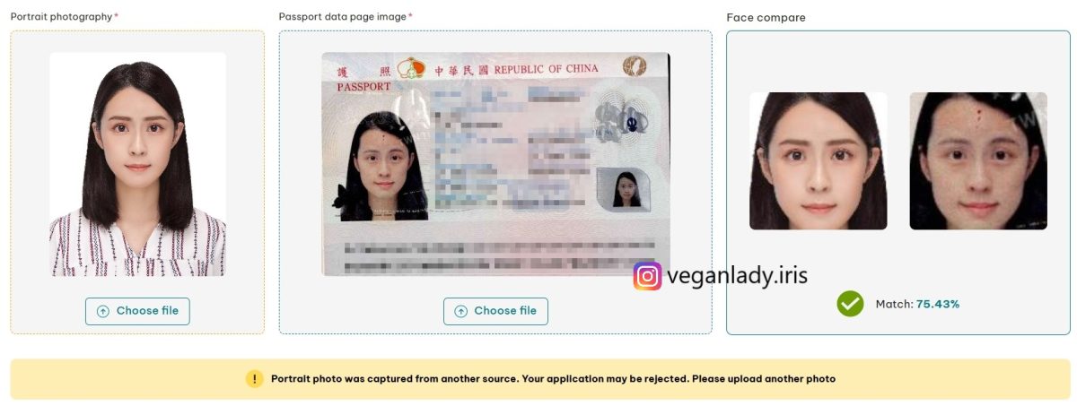 我上傳了兩次不同的照片,雖然相似度的 % 數看差不多,但你們看下面張有多一行黃底的字,就是系統判定覺得太不像了🤣🤣可能不會過,如果出現那行字就建議換照片喔