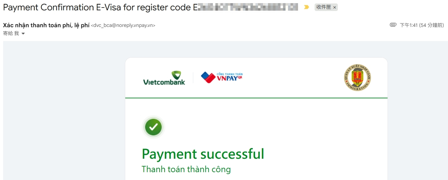 第二封 Payment Confirmation E-Visa for register code E…… 是付款成功通知