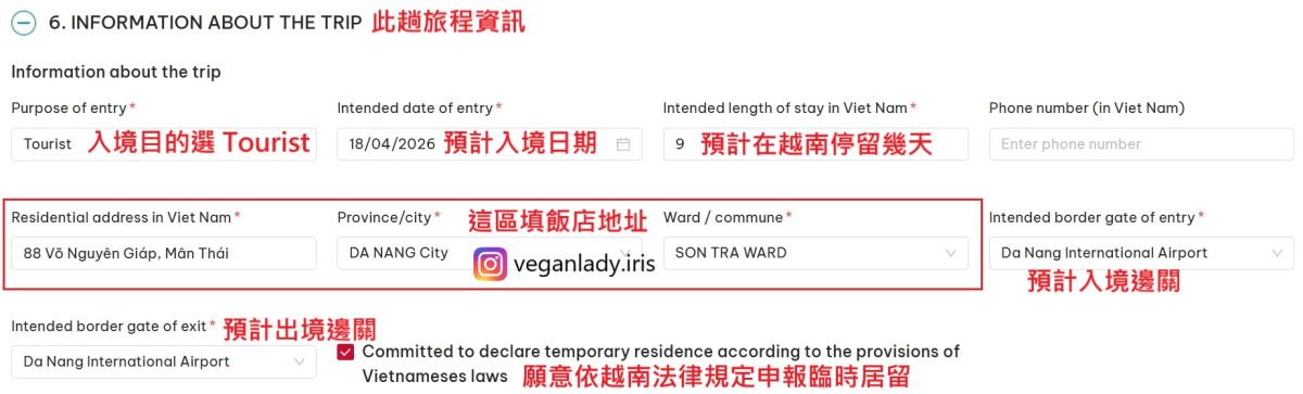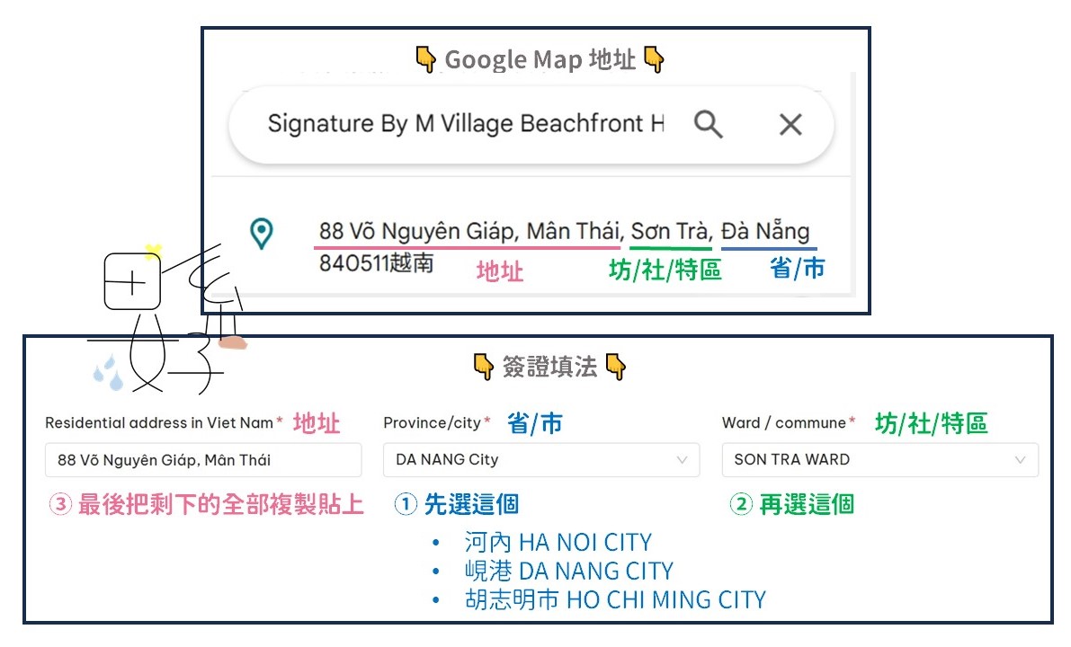 - 越南飯店的英文地址:直接看 Google Map 上的最完整 (如果有換住宿的話,通常會寫第一晚住的那間) (底下有詳細填法教學)