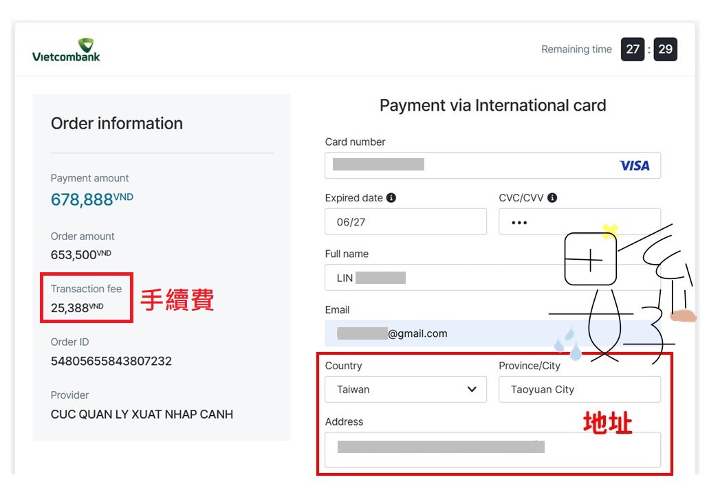 簽證的費用是單次入境 25 美元、多次入境 50 美元,不過你刷卡並不是直接刷美金,而是系統會把美金先換算成等值越盾,再讓你刷越盾,所以每次申請越簽的費用有一點點不同,可能是受到越盾匯率的影響而有所波動,是正常的喔